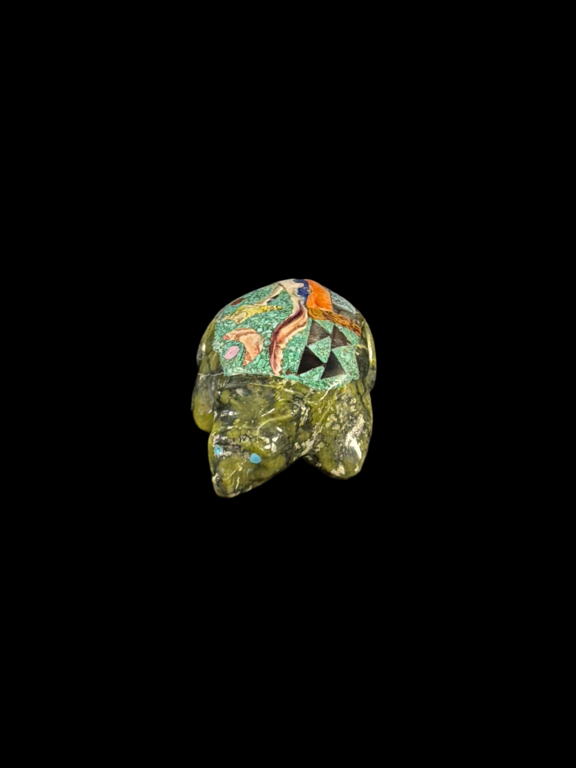 Mosaic bear fetish-carving made by Jayne Quam. Measuring 2 1/2”x 2”x 1”. This inlayed bear carving is made of Green Serpentine with Turquoise eyes, and a variety of shells and stones inlayed together on the back to create a beautiful scenery.
