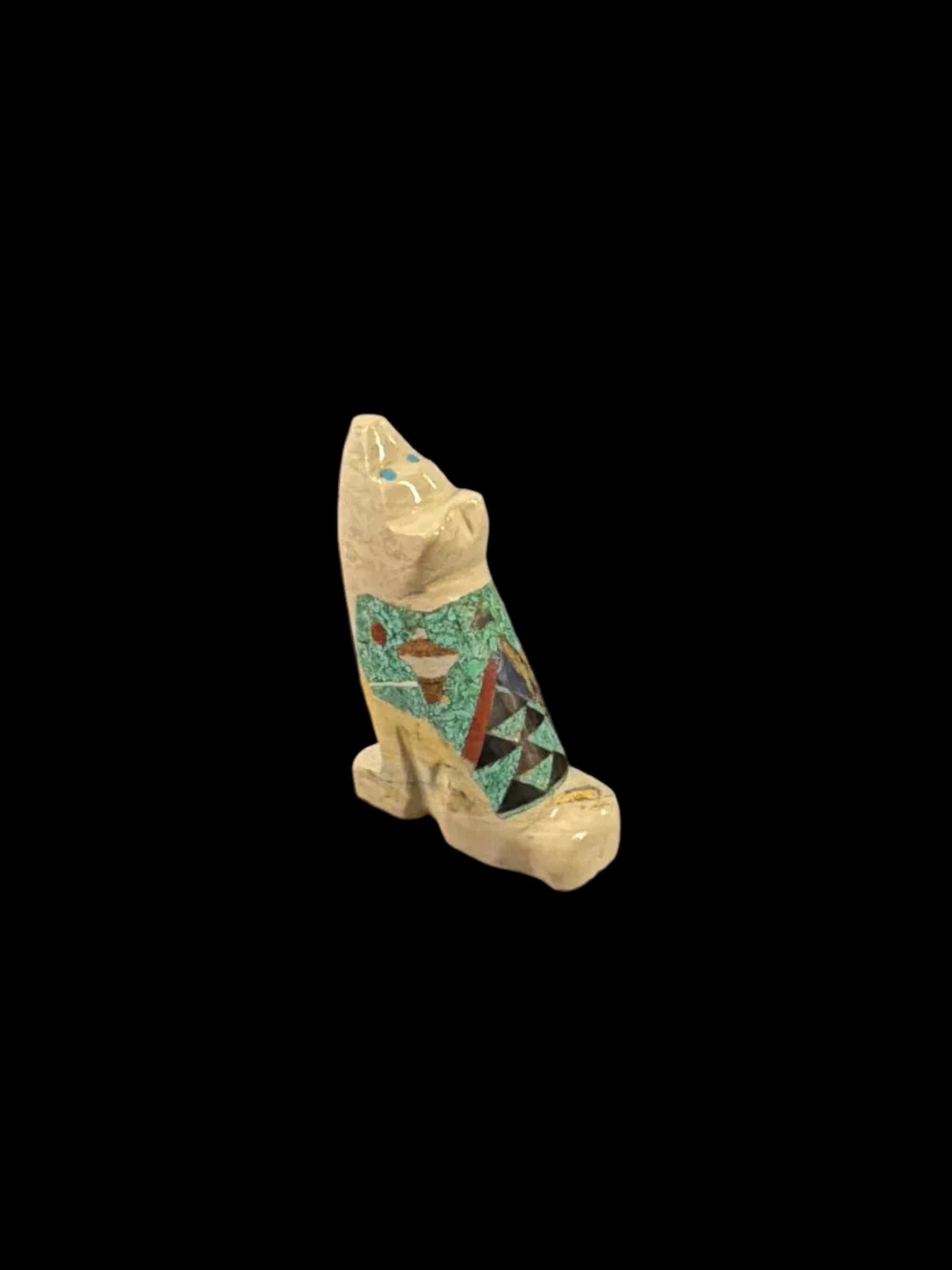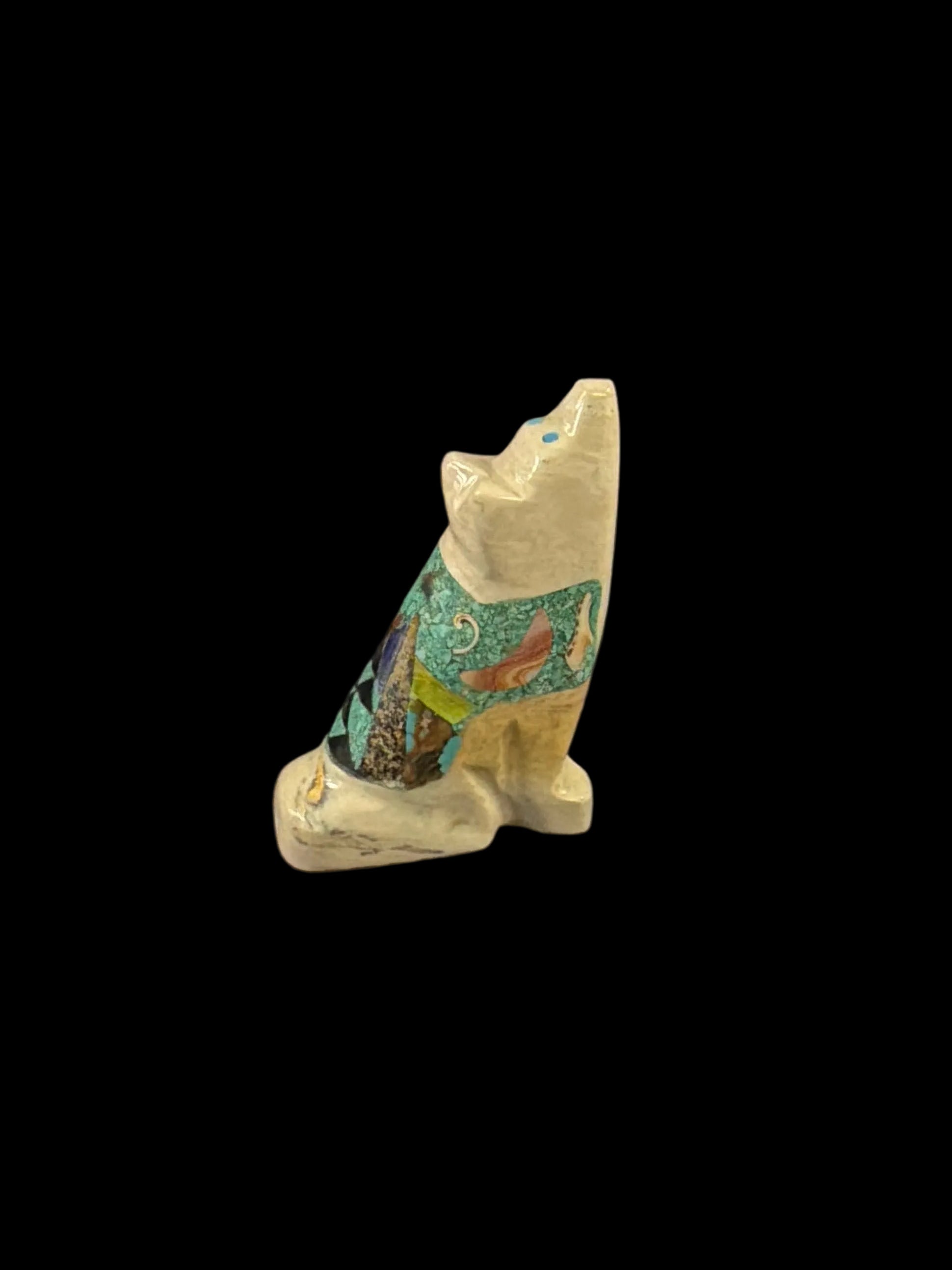 Mosaic howling wolf made by Jayne Quam. Measuring 1 1/2”x 1/2”x 2 1/2”. This wolf carving is made of fish rock with turquoise eyes, and a beautiful variety of shells and stones inlayed around.