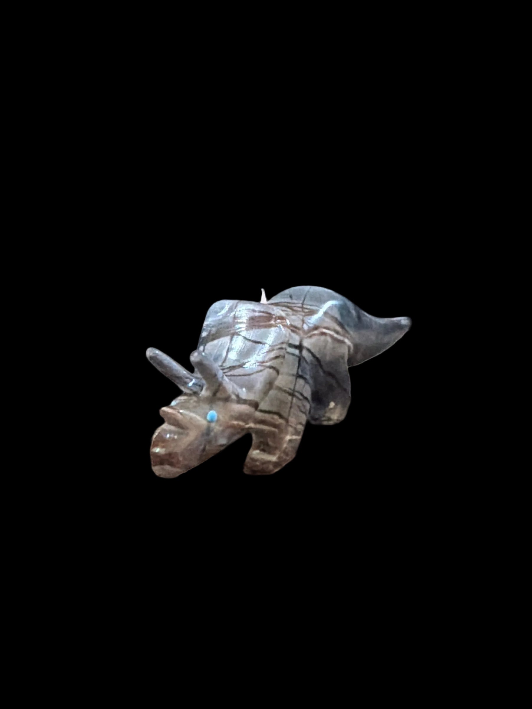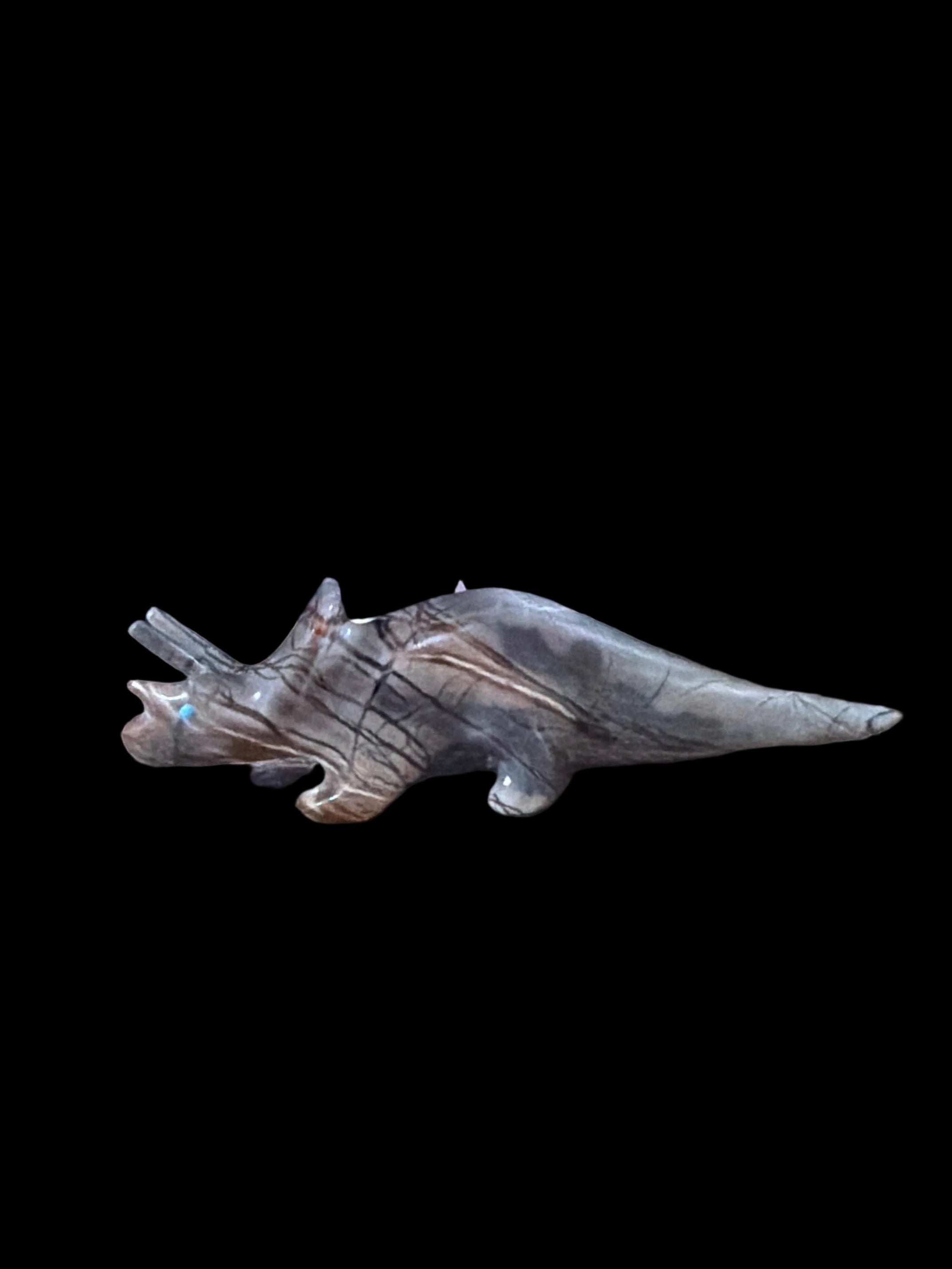 Ready to take out a T-rex, get this awesome triceratops (T-tops) carved from Picasso marble by the one and only Shannon Calavaza. The left horn was broken off but it is glued back on.