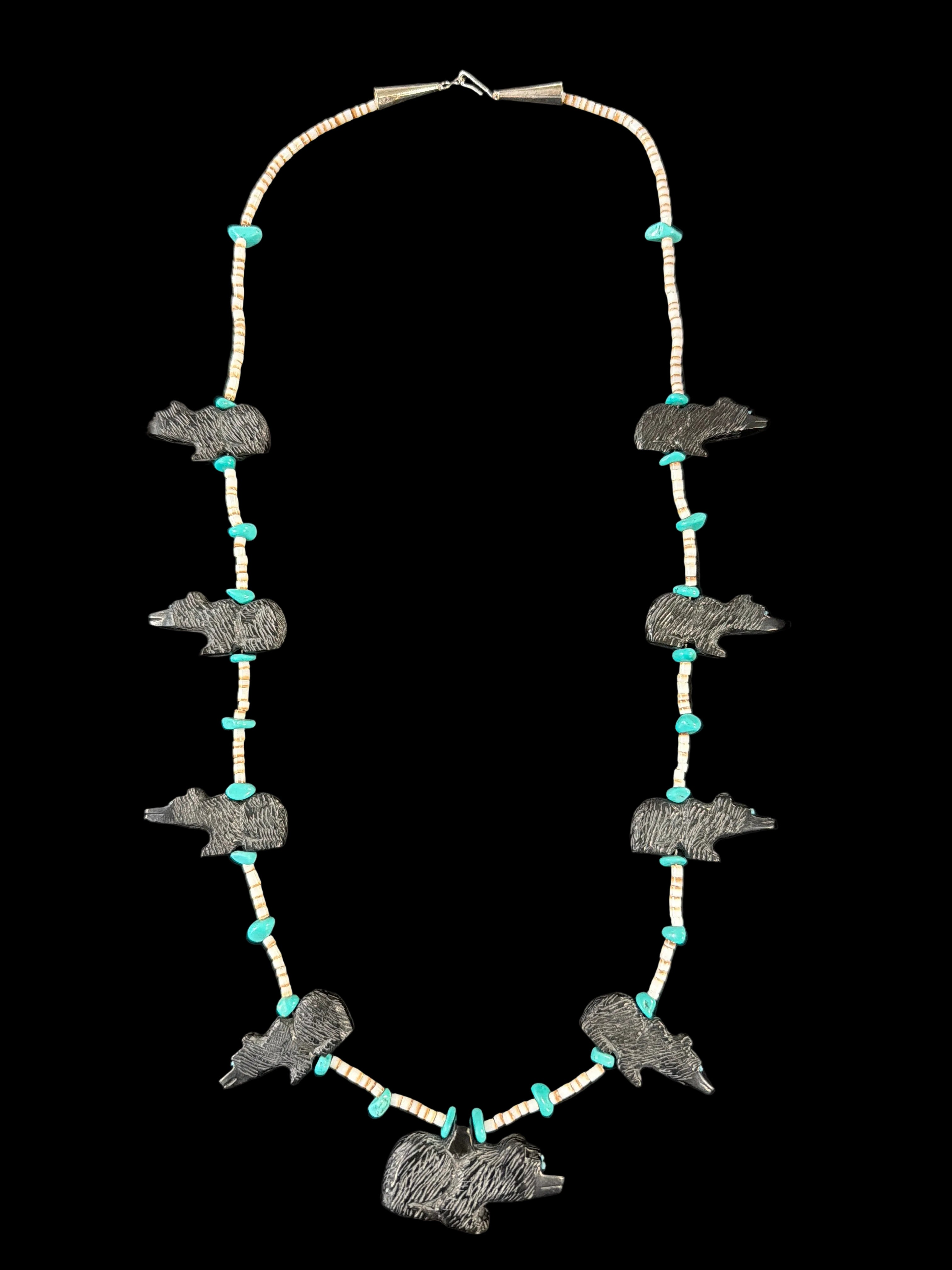 Jet fetish necklace and earrings made by Mike Tucson. The necklace measures 31” long while the earrings are 2 1/2”x 1 1/2”.