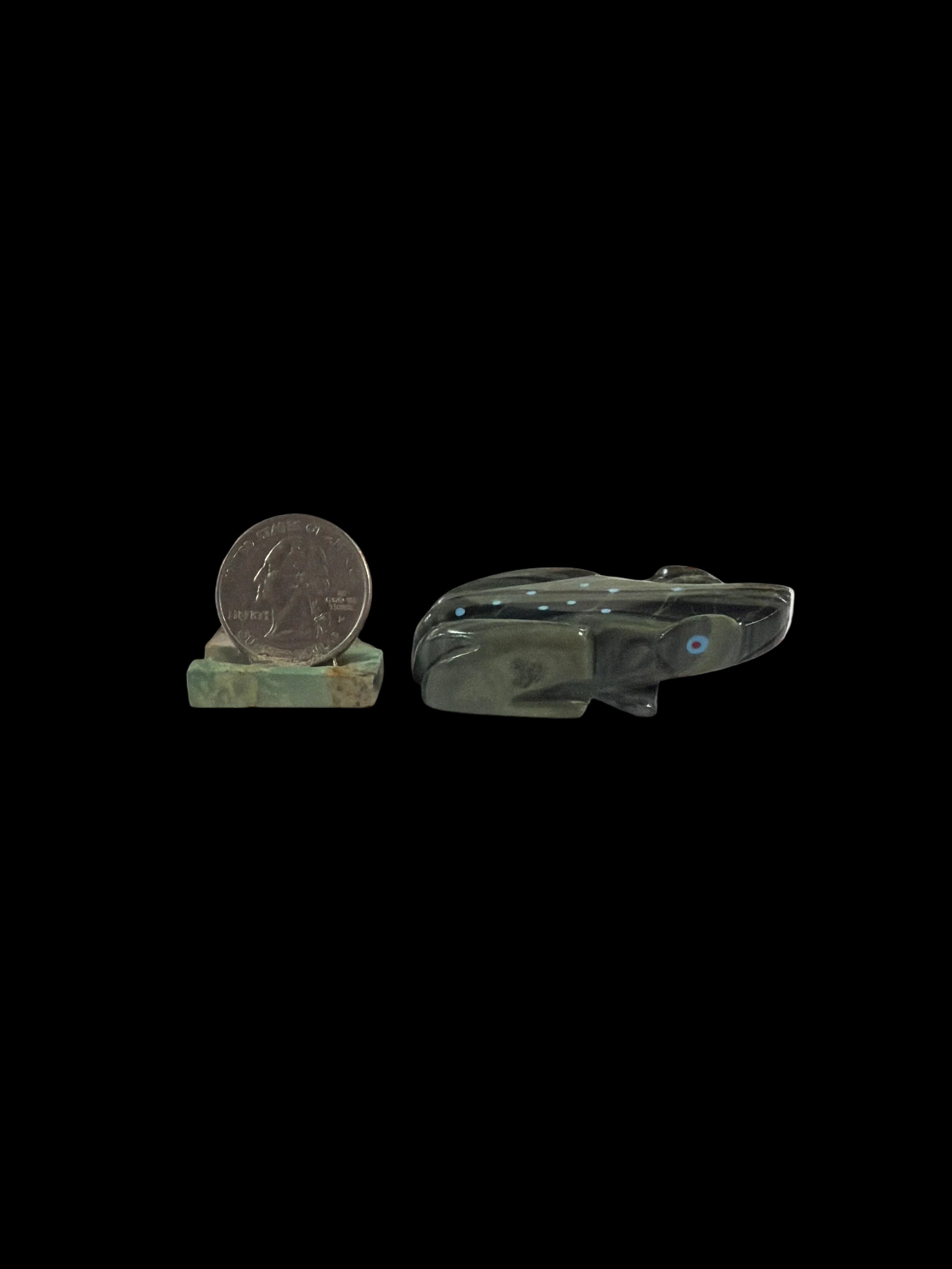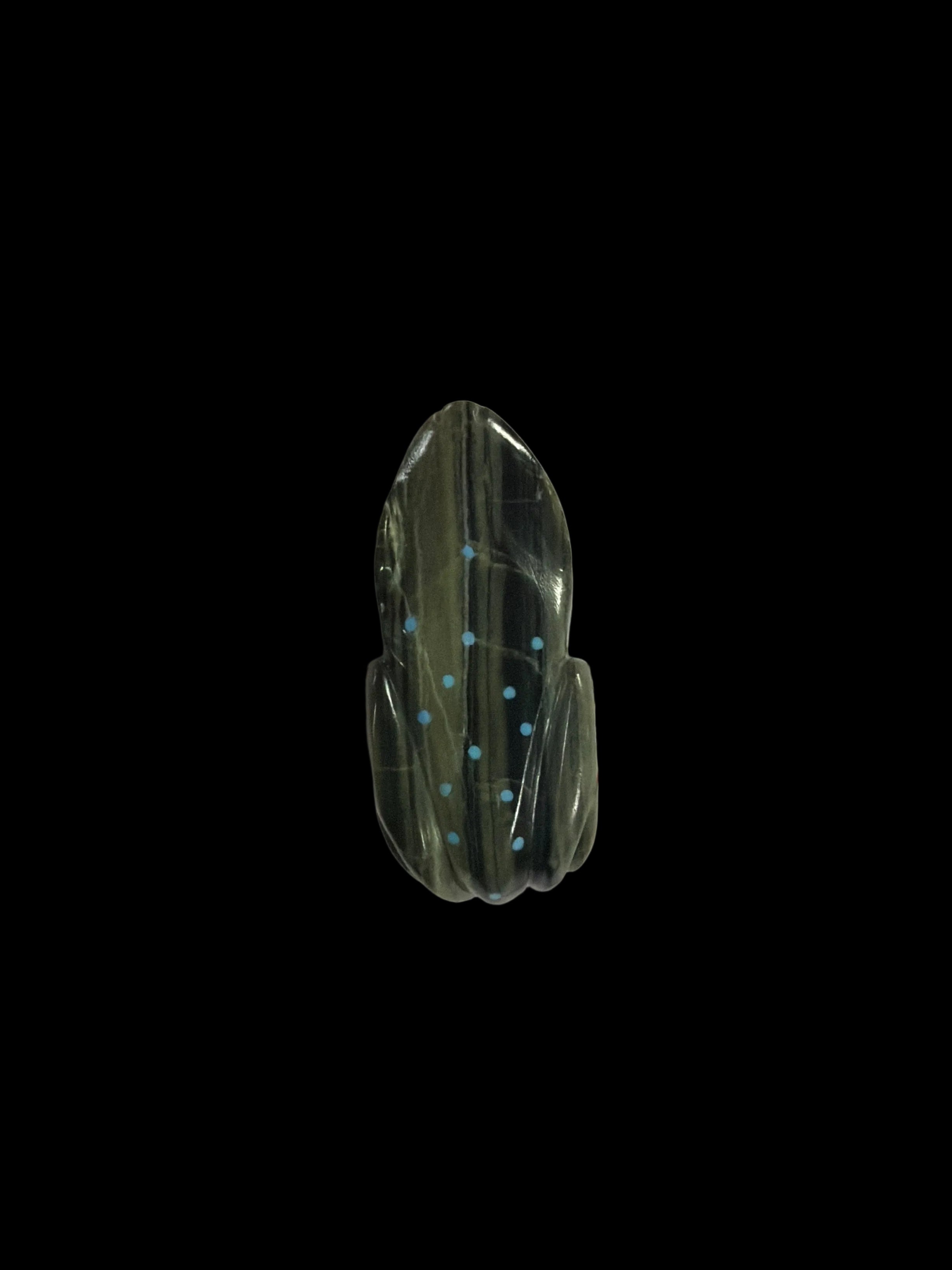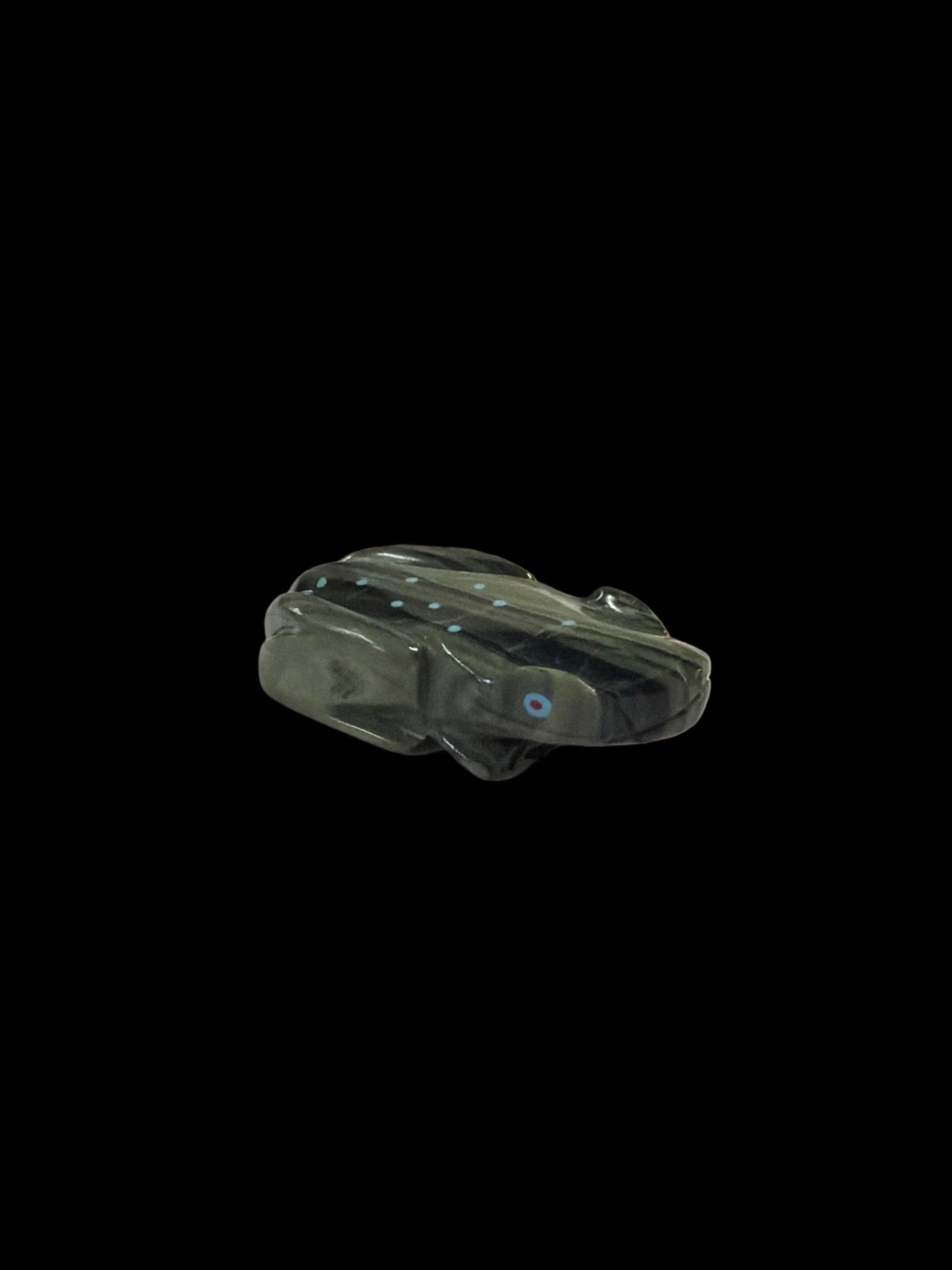 Ricolite frog carving with inlayed turquoise on the back and eyes made by Alex Tsethlikai. Measuring approximately 2 1/4”x 1”x 1/2”.