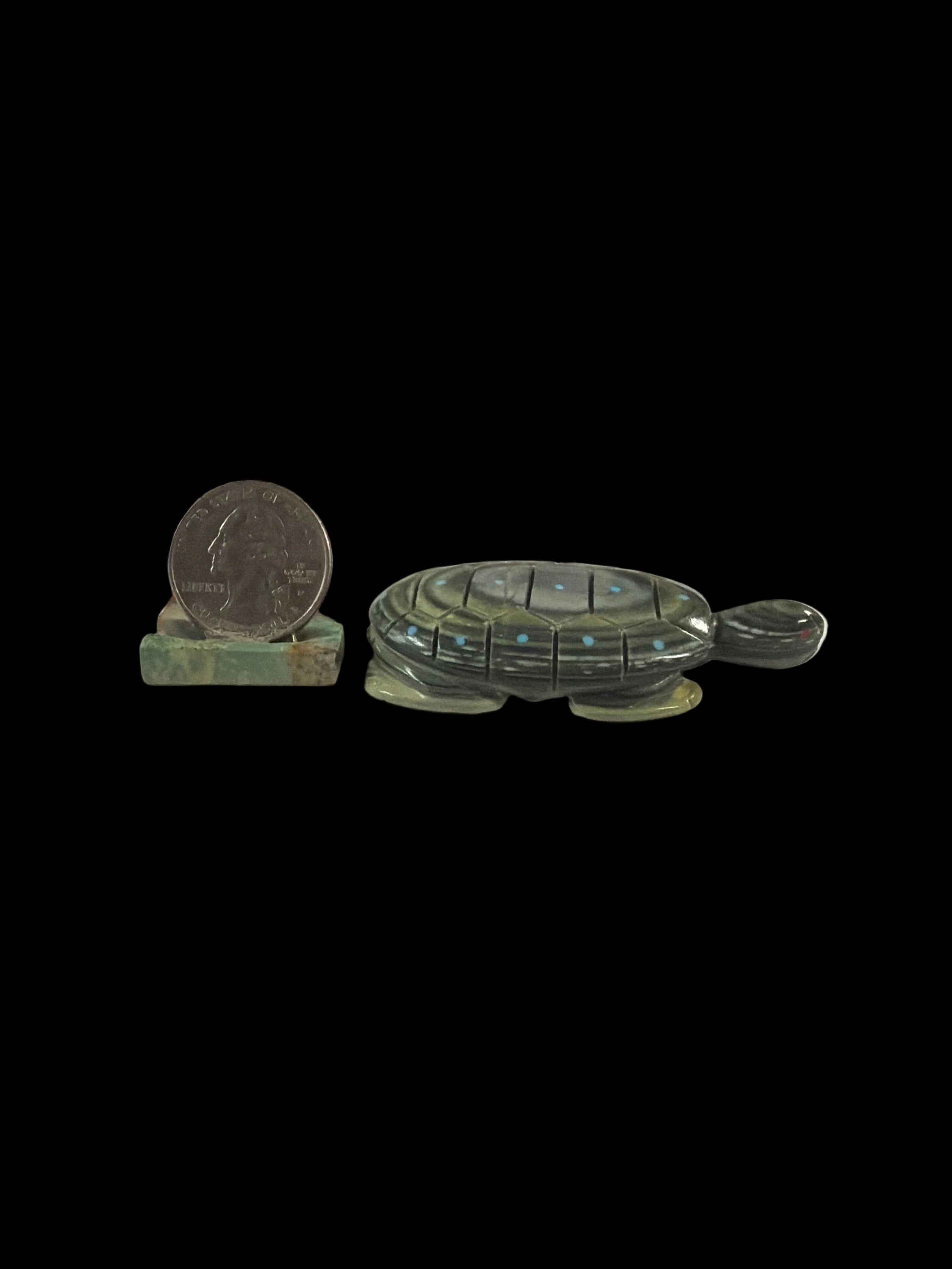 Ricolite turtle carving with inlayed turquoise on back made by Alex Tsethlikai. Measuring approximately 2 3/4”x 1 1/4”x 1/2”.